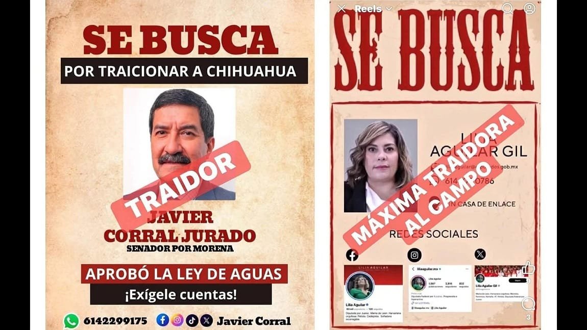 CHIHUAHUA.- Con imágenes de “Se busca máxima traidora al campo” y “Se busca por traicionar a Chihuahua”, agricultores compartieron esta tarde en redes sociales las imágenes de la diputada Lilia Aguilar Gil y del senador Javier Corral Jurado.