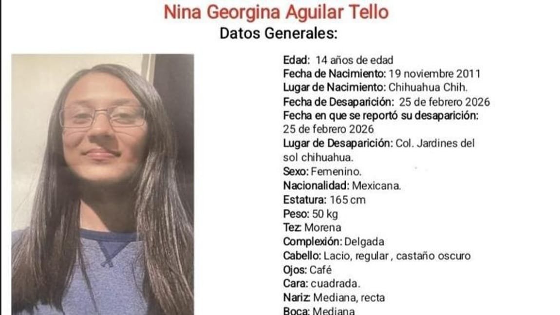 CHIHUAHUA.- Nina Georgina Aguilar Tello, de 14 años de edad, desapareció en la colonia Jardines del Sol. La Fiscalía General del Estado publicó su pesquisa.