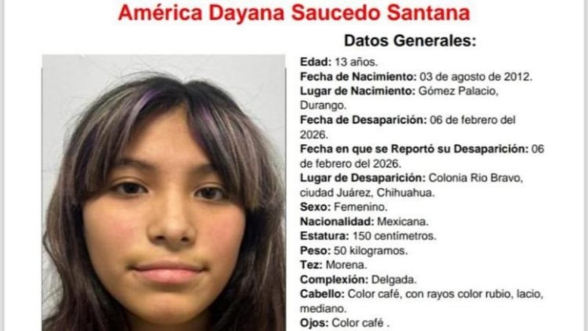 JUÁREZ.- La Fiscalía solicita ayuda para encontrar a la jovencita América Dayana Saucedo Santana de 13 años quien desapareció el 6 de febrero del presente año en la colonia Río Bravo en Ciudad Juárez, Chihuahua.