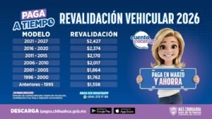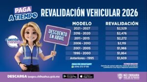 CHIHUAHUA.- La Secretaría de Hacienda de Gobierno del Estado de Chihuahua, informó este jueves de los costos y descuentos proyectados para la Revalidación Vehicular 2026. Aquí presentamos los detalles.