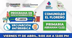 CAMARGO.- El Gobierno Municipal de Camargo, a través de la Dirección de Servicios Municipales y Ecología y en coordinación con instancias de salud, invita a la ciudadanía a participar en una jornada integral de descacharrización y vacunación antirrábica, que se llevará a cabo en la comunidad de El Floreño.