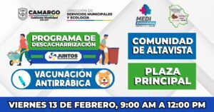 CAMARGO.- Con el objetivo de fortalecer las acciones preventivas en materia de salud pública y mantener espacios más limpios, el Gobierno Municipal de Camargo, a través de la Dirección de Servicios Municipales y Ecología y en coordinación con el sector salud, llevará a cabo el Programa de Descacharrización y Vacunación Antirrábica en la localidad de Altavista.