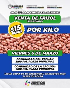 CAMARGO.- El Gobierno Municipal invita a las familias a aprovechar la venta de frijol subsidiado a $15 pesos por kilo, una acción que busca apoyar la economía familiar y acercar productos básicos a las comunidades.
