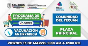 CAMARGO.- El Gobierno Municipal de Camargo, a través de la Dirección de Servicios Municipales y Ecología, en coordinación con MediChihuahua, invita a los habitantes de la comunidad de El Tecuán a participar en la jornada del Programa de Descacharrización y Vacunación Antirrábica.