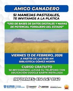 La actividad se llevará a cabo el viernes 13 de febrero de 2026, a partir de las 8:30 de la mañana, en la Biblioteca Gómez Morín, y será impartida por personal especializado en el uso de herramientas digitales aplicadas al campo.