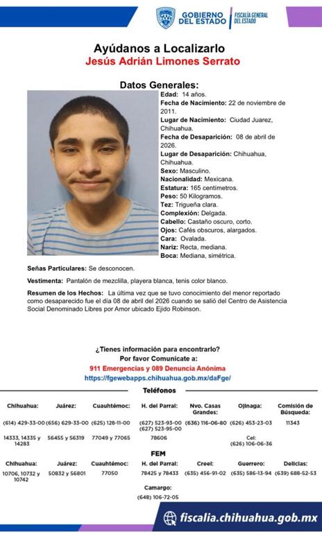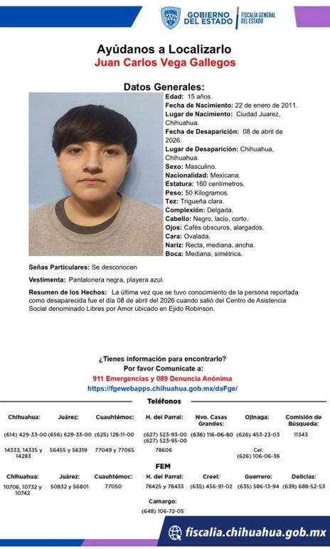 De acuerdo con las fichas emitidas por la Fiscalía General del Estado de Chihuahua, se trata de Juan Carlos Vega Gallegos, de 15 años, y Jesús Adrián Limones Serrato, de 14 años, quienes fueron vistos por última vez el pasado 8 de abril de 2026.