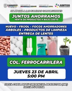 CAMARGO.- Con el objetivo de seguir apoyando la economía de las familias camarguenses, el Gobierno Municipal de Camargo, a través de la Dirección de Desarrollo Humano y la Dirección de Desarrollo Rural, invita a la ciudadanía a participar en una nueva jornada del programa “Juntos Ahorramos”, que se llevará a cabo en la colonia Ferrocarrilera.